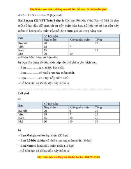 …………………………………………………………………………………. L i ờ giải a) Số h t ạ đ u ậ B n ạ N y m ả ầm Không n y m ả ầm Tổng Rô-bốt 20 0 20 Việt 18 7 25 Nam 15 10 25 Mai 20 10 30 b) – B n ạ Mai gieo nhi u h ề t ạ nhất. (30 h t ạ ) – B n ạ Rô-b t ố và Mai có nhi u ề h t ạ n y m ả ầm nhất. (20 h t ạ ) – B n ạ Nam có ít h t ạ n y m ả ầm nh t ấ . (15 h t ạ ) – Cả bốn b n ạ có số h t ạ đ u n ậ y ả m m ầ là: M i