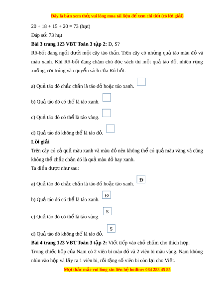 Bài 3 trang 123 VBT Toán 3 tập 2: Đ, S? Rô-bốt đang ng i ồ dư i ớ m t ộ cây táo th n. ầ Trên cây có nh ng ữ quả táo màu đỏ và màu xanh. Khi Rô-b t ố đang chăm chú đ c ọ sách thì m t ộ quả táo đ t ộ nhiên r ng ụ xuống, r i ơ trúng vào quy n s ể ách c a R ủ ô-b t ố . a) Qu t ả áo đó chắc ch n ắ là táo đ ho ỏ c ặ táo xanh. b) Quả táo đó có th l ể à táo xanh. c) Qu t ả áo đó có th l ể à táo vàng. d) Quả táo đó không th l ể à táo đ . ỏ L i ờ giải