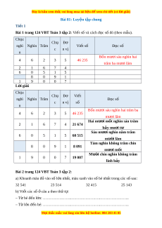 Bài 1 trang 124 VBT Toán 3 t p 2: ậ Vi t ế số và cách đ c ọ số đó (theo m u) ẫ . Chục Chụ Đơ nghì Nghìn Trăm Vi t ế số Đ c ọ số c n vị n Bốn mư i ơ sáu nghìn hai 4 6 2 3 5 46 235 trăm ba mư i ơ lăm 2 1 6 7 4 6 0 5 1 5 8 0 9 1 1 9 0 0 7 L i ờ giải Chục Chụ Đơ Vi t ế nghì Nghìn Trăm Đ c s ọ ố c n vị số n Bốn mư i ơ sáu nghìn hai trăm ba 4 6 2 3 5 46 235 mư i ơ lăm Hai mư i ơ m t ố nghìn sáu trăm 2 1 6 7 4 21 674 bảy mu i ơ tư Sáu mư i ơ nghìn năm trăm 6 0 5 1 5 60 515 mư i ờ lăm