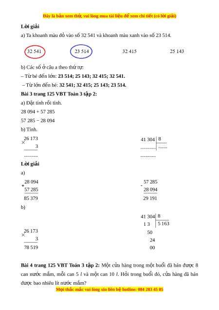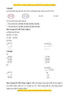 Bài 3 trang 125 VBT Toán 3 t p 2: ậ a) Đ t ặ tính r i ồ tính. 28 094 + 57 285 57 285 − 28 094 b) Tính. 26 173 41 304 8 3 ............ ....... ........... ............ L i ờ giải a) 28 094 57 285 57 285 28 094 85 379 29 191 b) 41 304 8 1 3 5 163 26 173 50 3 24 78 519 00