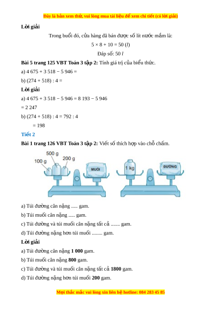Bài 1 trang 126 VBT Toán 3 t p 2: ậ Vi t ế số thích h p vào ch ợ ch ỗ m ấ . a) Túi đư ng cân ờ n ng ..... gam ặ . b) Túi mu i ố cân n ng ..... gam ặ . c) Túi đư ng và ờ túi mu i ố cân n ng ặ t t ấ c ....... gam ả . d) Túi đư ng n ờ ng ặ h n t ơ úi mu i ố ........ gam. L i ờ giải a) Túi đư ng cân ờ n ng ặ 1 000 gam. b) Túi mu i ố cân n ng ặ 800 gam. c) Túi đư ng và ờ túi mu i ố cân n ng ặ t t ấ cả 1800 gam. d) Túi đư ng n ờ ng ặ h n t ơ úi mu i ố 200 gam. M i ọ thắc m c