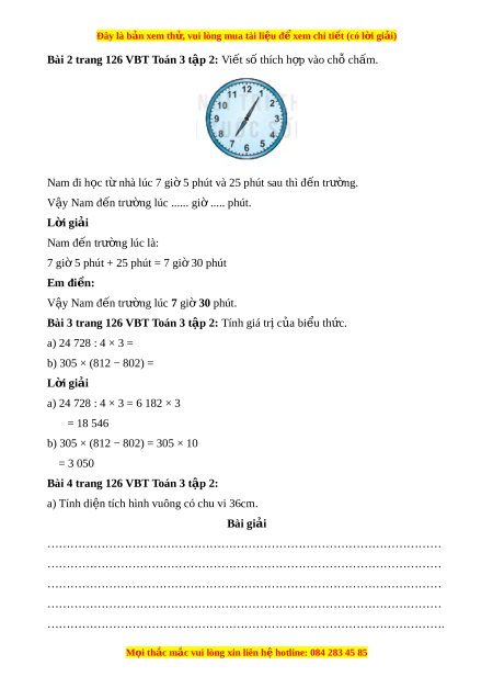 Bài 2 trang 126 VBT Toán 3 t p 2: ậ Vi t ế số thích h p vào ch ợ ch ỗ m ấ . Nam đi h c ọ t nhà l ừ úc 7 gi 5 phút ờ và 25 phút sau thì đ n t ế rư ng. ờ V y ậ Nam đ n t ế rư ng l ờ úc ...... gi ..... phút ờ . L i ờ giải Nam đ n ế trư ng ờ lúc là: 7 gi 5 phút ờ + 25 phút = 7 gi 30 phút ờ Em đi n: ề V y ậ Nam đ n t ế rư ng l ờ úc 7 gi ờ 30 phút.