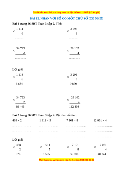 Bài 2 trang 56 SBT Toán 3 t p 2. ậ Đ t ặ tính rồi tính: 438 × 2 1 911 × 5 7 101 × 8 12 061 × 4 ………………. ………………. ………………. ………………. ………………. ………………. ………………. ………………. ………………. ………………. ………………. ………………. L i ờ giải 438 1 911 7 101 12 061 2 5 8 4 876 9 555 56 808 48 244