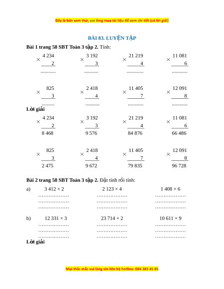Bài 1 trang 58 SBT Toán 3 t p 2. ậ Tính: 4 234 3 192 21 219 11 081 2 3 4 6 ............ ........... ............. ............ 825 2 418 11 405 12 091 3 4 7 8 .......... ........... ............ ............ L i ờ giải 4 234 3 192 21 219 11 081 2 3 4 6 8 468 9 576 84 876 66 486 825 2 418 11 405 12 091 3 4 7 8 2 475 9 672 79 835 96 728
