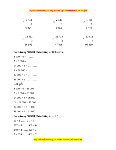 Bài 2 trang 58 SBT Toán 3 t p 2. ậ Đ t ặ tính rồi tính: a) 3 412 × 2 2 123 × 4 1 408 × 6 ……………… ……………… ……………… ……………… ……………… ……………… ……………… ……………… ……………… b) 12 331 × 3 23 714 × 2 10 611 × 9 ……………… ……………… ……………… ……………… ……………… ……………… ……………… ……………… ……………… L i ờ giải