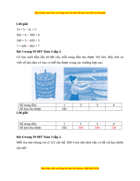 Bài 5 trang 59 SBT Toán 3 t p 2. ậ Cô Sao nuôi t m ầ l y ấ tơ d t ệ v i ả , m i ỗ nong t m ằ thu đư c ợ 182 kén. Hãy tính và vi t ế số kén t m ằ cô Sao có th t ể hu đư c ợ trong các trư ng ờ h p s ợ au: Số nong t m ằ 1 2 3 4 Số kén thu đư c ợ 182 L i ờ giải Số nong t m ằ 1 2 3 4 Số kén thu đư c ợ 182 364 546 728