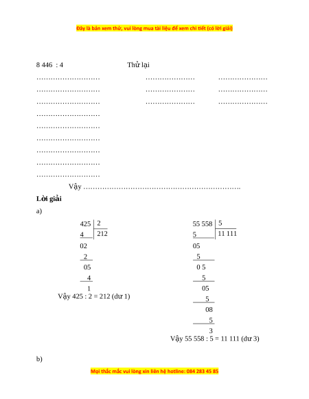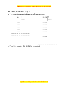 ậ …………………………………………………………. L i ờ giải a) 425 2 55 558 5 4 212 5 11 111 02 05 2 5 05 0 5 4 5 1 05 V y ậ 425 : 2 = 212 (d 1) ư 5 08 5 3 V y 55 558 : ậ 5 = 11 111 (d 3) ư b)