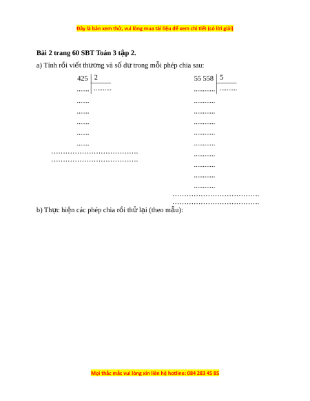 Bài 2 trang 60 SBT Toán 3 t p 2. ậ a) Tính rồi vi t ế thư ng và ơ s d ố t ư rong m i ỗ phép chia sau: 425 2 55 558 5 ....... .......... ............ .......... ....... ............ ....... ............ ....... ............ ....... ............ ....... ............