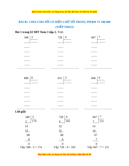 Bài 1 trang 63 SBT Toán 3 t p 2. ậ Tính: 348 2 728 4 847 7 ........ ......... ........ ......... ........ ......... ........ ........ ........ ........ ........ ........ ........ ........ ........ ........ ........ ........ ........ ........ ........ ……………………….. ……………………….. ……………………….. 896 8 651 3 846 6 ........ ......... ........ ......... ........ ......... ........ ........ ........ ........ ........ ........ ........ ........ ........ ........ ........ ........ ........ ........ ........ ……………………….. ……………………….. ……………………….. L i ờ giải 348 2 728 4 847 7 2 174 4 182 7 121 14 32 14 14 32 14 08 08 07 8 8 7 0 0 0 V y 348 : ậ 2 = 174 V y 728 : ậ 4 = 182 V y 847 : ậ 7 = 121