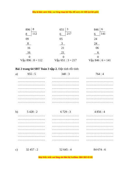 Bài 2 trang 64 SBT Toán 3 t p 2. ậ Đ t ặ tính rồi tính: a) 955 : 5 348 : 3 764 : 4 ……………………… ……………………… ……………………… ……………………… ……………………… ……………………… ……………………… ……………………… ……………………… ……………………… ……………………… ……………………… ……………………… ……………………… ……………………… ……………………… ……………………… ……………………… ……………………… ……………………… ……………………… ……………………… ……………………… ……………………… b) 5 428 : 2 6 729 : 3 4 856 : 4 ……………………… ……………………… ……………………… ……………………… ……………………… ……………………… ……………………… ……………………… ……………………… ……………………… ……………………… ……………………… ……………………… ……………………… ……………………… ……………………… ……………………… ……………………… ……………………… ……………………… ……………………… ……………………… ……………………… ……………………… c) 32 457 : 2 52 645 : 4 84 674 : 6