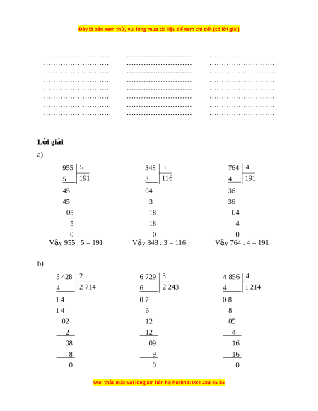 ……………………… ……………………… ……………………… ……………………… ……………………… ……………………… ……………………… ……………………… ……………………… ……………………… ……………………… ……………………… ……………………… ……………………… ……………………… ……………………… ……………………… ……………………… ……………………… ……………………… ……………………… ……………………… ……………………… ……………………… L i ờ giải a) 955 5 348 3 764 4 5 191 3 116 4 191 45 04 36 45 3 36 05 18 04 5 18 4 0 0 0 V y 955 : ậ 5 = 191 V y 348 : ậ 3 = 116 V y ậ 764 : 4 = 191 b) 5 428 2 6 729 3 4 856 4 4 2 714 6 2 243 4 1 214 1 4 0 7 0 8 1 4 6 8 02 12 05 2 12 4 08 09 16 8 9 16 0 0 0