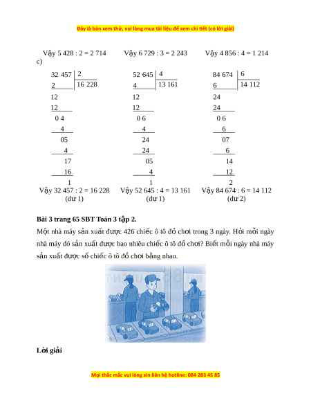 V y ậ 5 428 : 2 = 2 714 V y 6 729 : ậ 3 = 2 243 V y ậ 4 856 : 4 = 1 214 c) 32 457 2 52 645 4 84 674 6 2 16 228 4 13 161 6 14 112 12 12 24 12 12 24 0 4 0 6 0 6 4 4 6 05 24 07 4 24 6 17 05 14 16 4 12 1 1 2 V y ậ 32 457 : 2 = 16 228 V y 52 645 : ậ 4 = 13 161 V y ậ 84 674 : 6 = 14 112 (dư 1) (d 1) ư (d 2) ư