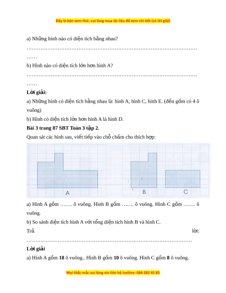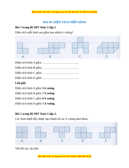 Bài 1 trang 86 SBT Toán 3 t p 2 ậ Di n t ệ ích mỗi hình sau g m ồ bao nhiêu ô vuông? Di n t ệ ích hình A g m