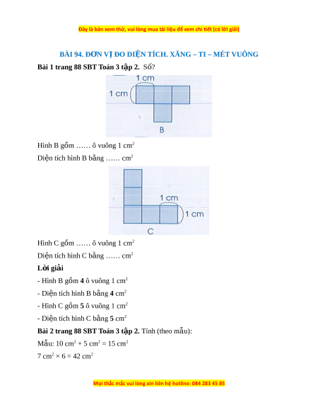 Bài 1 trang 88 SBT Toán 3 t p 2. ậ Số? Hình B g m ồ …… ô vuông 1 cm2 Di n t ệ ích hình B b ng ằ …… cm2 Hình C g m ồ …… ô vuông 1 cm2 Di n t ệ ích hình C b ng ằ …… cm2 L i ờ giải