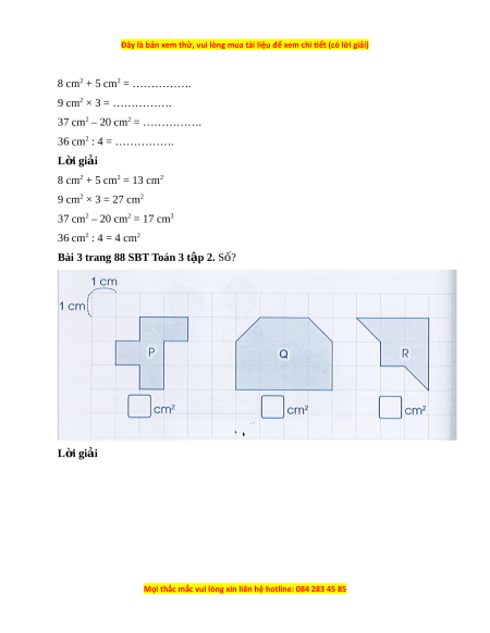 37 cm2 – 20 cm2 = ……………. 36 cm2 : 4 = ……………. L i ờ giải 8 cm2 + 5 cm2 = 13 cm2 9 cm2 × 3 = 27 cm2 37 cm2 – 20 cm2 = 17 cm3 36 cm2 : 4 = 4 cm2