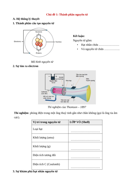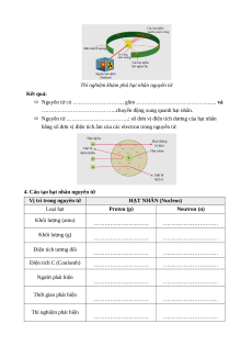 Vị trí trong nguyên tử HẠT NHÂN (Nucleus) Loại hạt Proton (p) Neutron (n) Khối lượng (amu) ………………………… ………………………… Khối lượng (g) ………………………… ………………………… Điện tích tương đối ………………………… ………………………… Điện tích C (Coulomb) ………………………… ………………………… Người phát hiện ………………………… ………………………… Thời gian phát hiện ………………………… ………………………… Thí nghiệm phát hiện ………………………… …………………………
