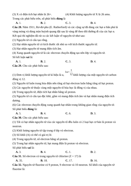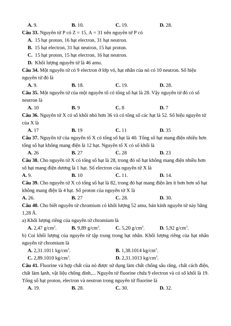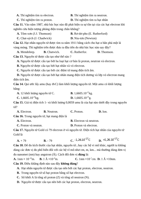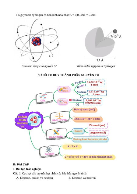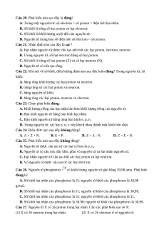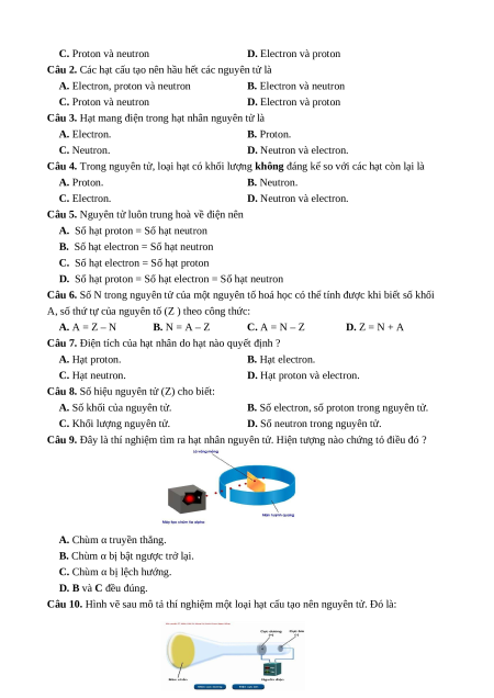 Câu 1. Các hạt cấu tạo nên hạt nhân của hầu hết nguyên tử là