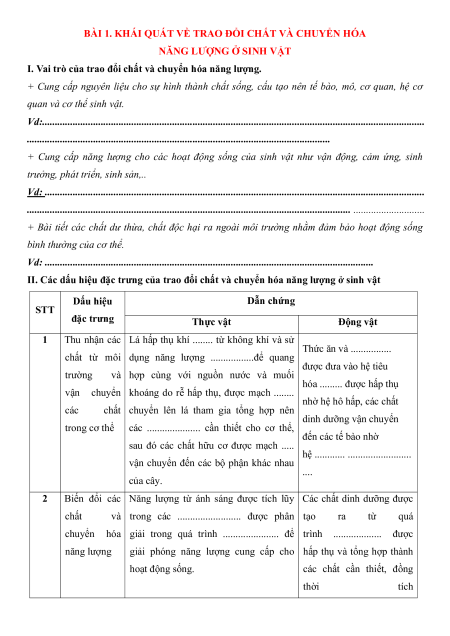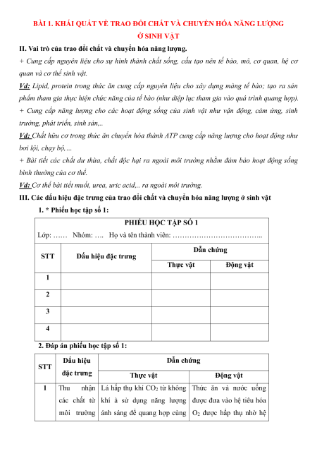 I. Vai trò của trao đổi chất và chuyển hóa năng lượng.